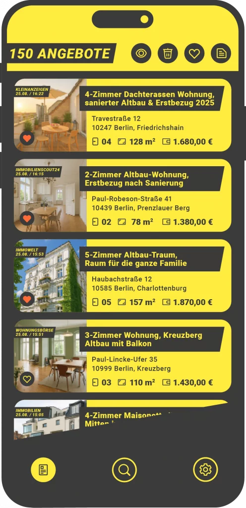 Der Immobilien Bot zeigt jedes Angebot mit Bild, Plattformname, Zimmer, m² und Preis – gesehene Anzeigen werden automatisch ausgegraut. So erkennst du blitzschnell, was wirklich neu ist, ohne Tab-Hopping.